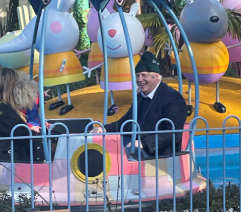 強森演講時找不到講稿上的段落,於是開始聊佩佩豬。圖為強森和太太、小孩到佩佩豬世界乘坐遊樂設施。(路透)