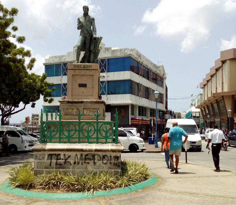 在巴貝多宣布廢除英國女王的國家元首地位後,當地英國皇家海軍納爾遜(Horatio Nelson)中將的雕像,遭巴貝多民眾破壞。(路透)
