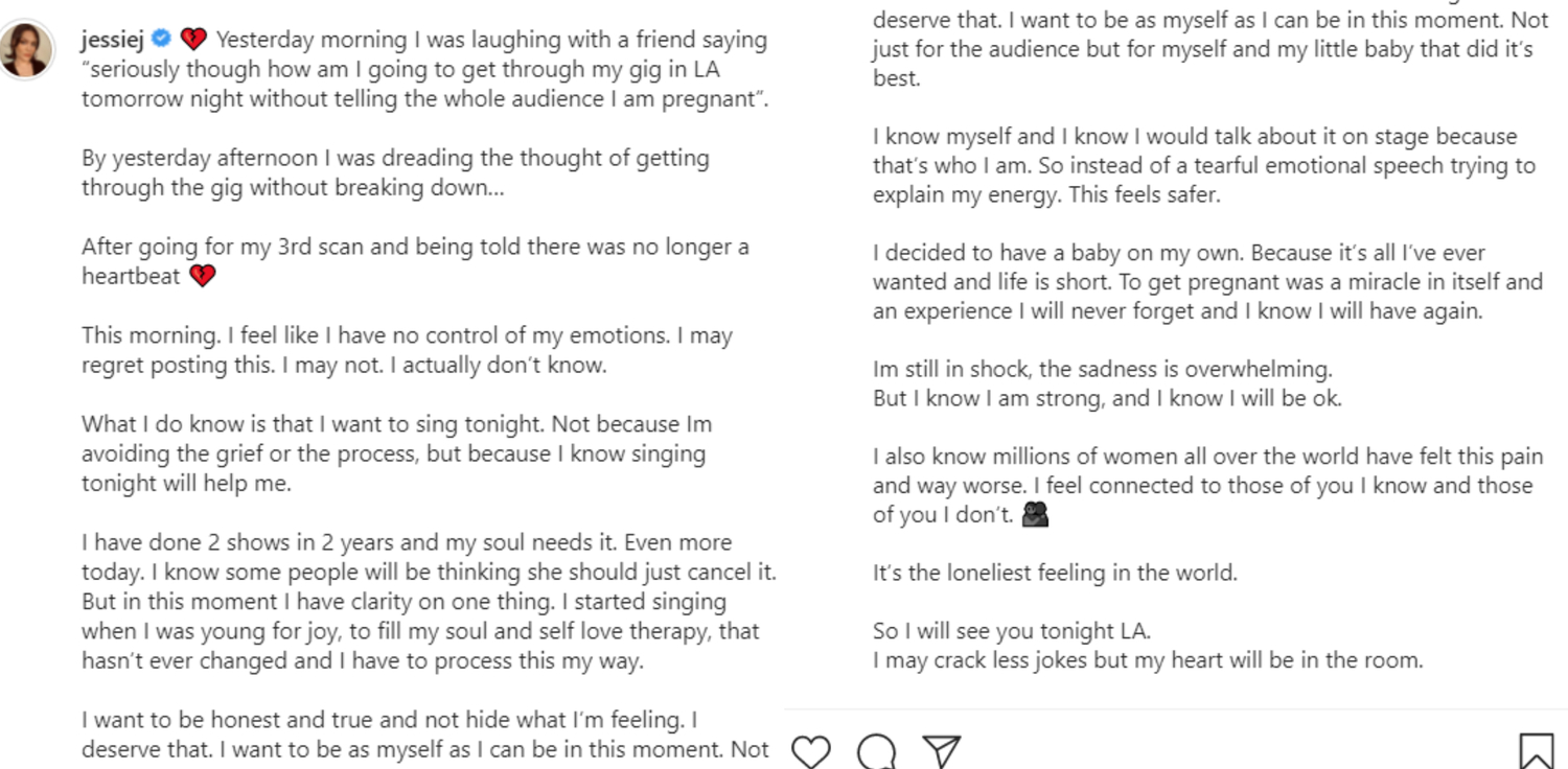 潔西J在IG發長文,表示原本正在想著如何在晚上的演出中,瞞著觀眾自己懷孕的事,沒想到卻在昨(24)日下午進行第3次產檢時,被醫生告知「寶寶沒有心跳」,讓她震驚又難過,她說道「決定生孩子是我一直都想要的,而生命非常短暫,懷孕本身就是一個奇蹟,這是我永遠都不會忘記的經歷,我知道我會再次擁有。」而她也宣布今(25)日晚上在洛杉磯的演出將照樣舉行,她坦言「我今晚想唱歌。不是為了逃避悲傷或過程,而是因為我知道今晚唱歌對我有幫助」。