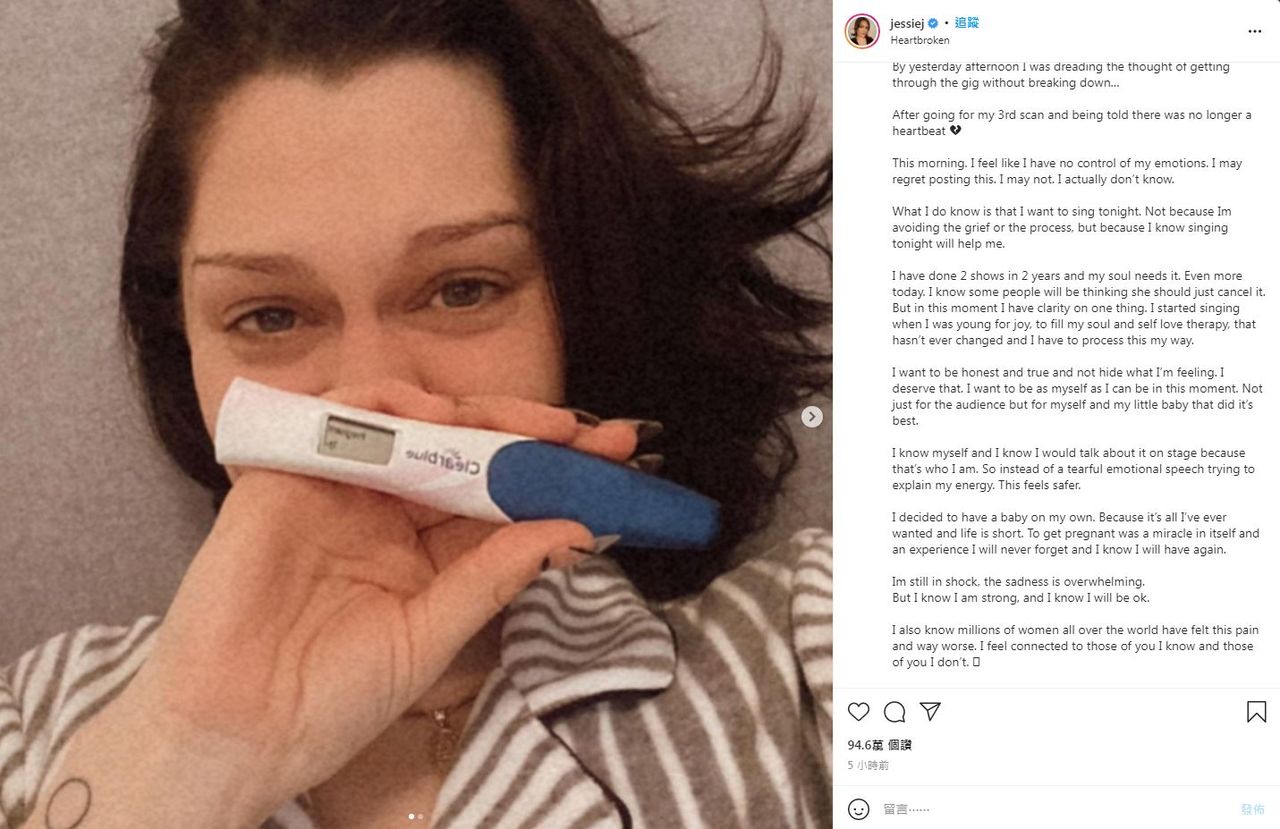 英國天后Jessie J在今(25日)凌晨突然發文,以300字長文附上自己與懷孕測試陽性的合影照片分享自己不幸流產的消息。並在文中寫道:「我還在震驚當中,悲傷壓倒了一切,但我知道我很堅強,我知道我會沒事的。」消息一出,令大批網友都心碎,底下瞬間湧入大量留言給予她祝福和安慰。