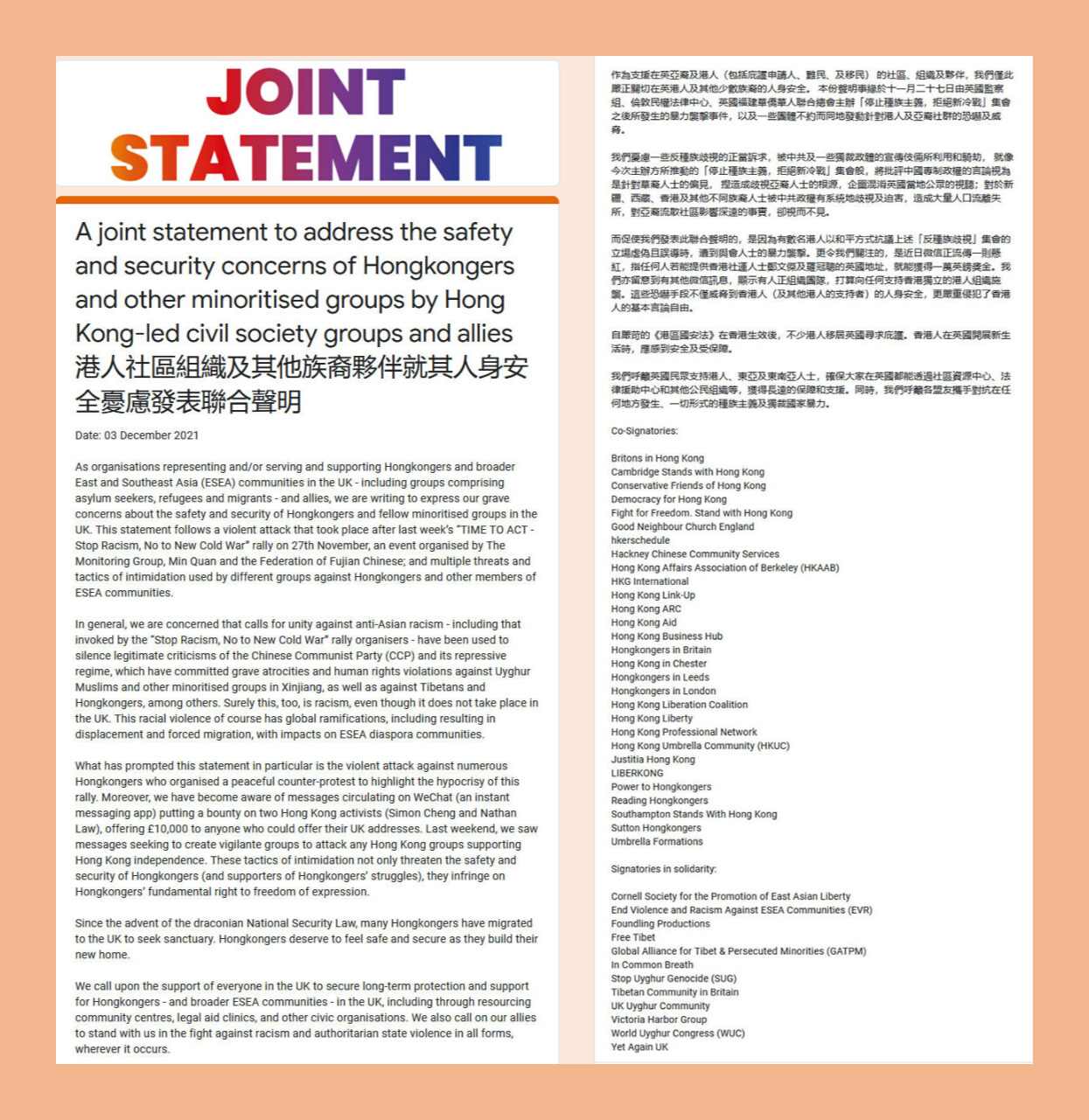 近30個海外港人組織參與聯署,包括「英國港僑協會」(Hongkongers in Britain, HKB)、「重光團隊」(Fight for Freedom. Stand with Hong Kong, SWHK)、新成立的「香港協會」(Hong Kong Umbrella Community, HKUC),以及多個英國各地港人組織;另外超過10個藏人和維吾爾人組織,包括「自由西藏」(Free Tibet)以及「世界維吾爾代表大會」(World Uyghur Congress, WUC)等都參與了聯署。