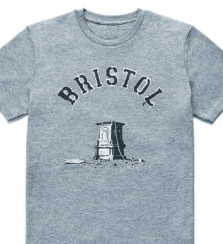 這款灰色T恤印有「Bristol」字樣和一個空蕩蕩的銅像基座,基座上還留着一條拆除基座上一尊十七世紀奴隸販子科斯頓(Edward Colston)銅像的繩索。原本T恤售價二十五英鎊,每人限購一件。但網上很快有人轉售,一名賣家開價九千英鎊(九萬二千六百四十五港元)。