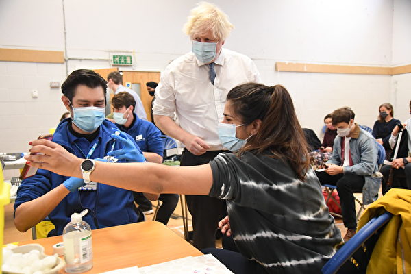 2021年12月13日,英國首相鮑里斯‧約翰遜(Boris Johnson )訪問倫敦威斯敏斯特的斯托健康疫苗接種中心。(Jeremy Selwyn-WPA Pool/Getty Images)