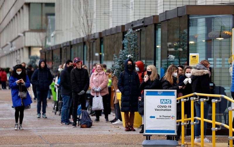 英國出現Omicron死亡病例,為全球首例。圖為在接種站外等待接種加強劑的英國民眾。(法新社)