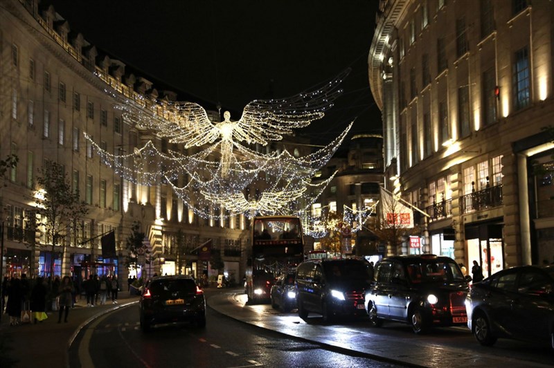 英國首相強生13日表示,至少有一名感染COVID-19 Omicron變異株的患者已經死亡。圖為西倫敦耶誕點燈。(倫敦市政府提供)