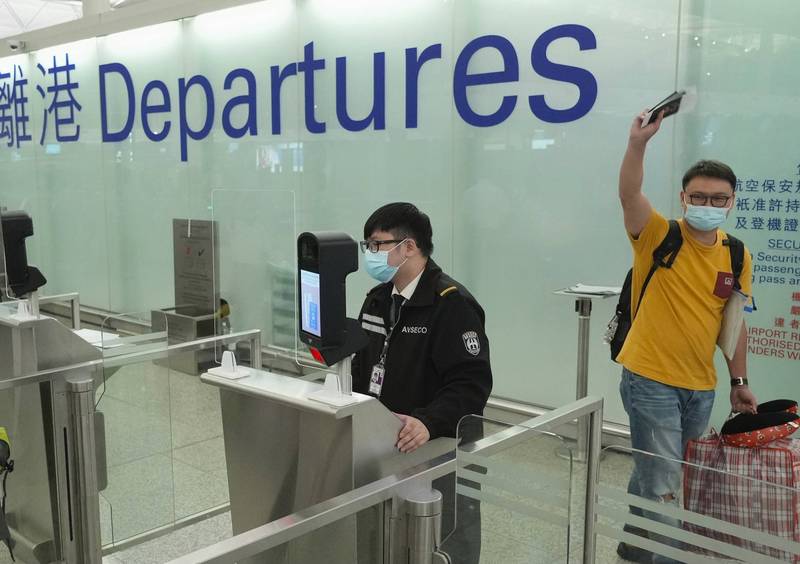 一名即將前往英國的香港人士,在香港國際機場開心的向朋友揮手道別。(美聯社資料照)