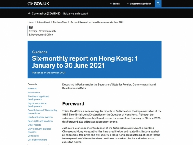 英國政府發表《香港問題半年報告》,描述香港今年上半年的情況。英國外相卓慧思在報告中表示,香港的自由受到侵蝕是對自由和民主的侮辱,指港區國安法出台僅一年多,北京與香港當局就利用有關法例及機構,打擊香港的所有反對派、新聞自由和公民社會。