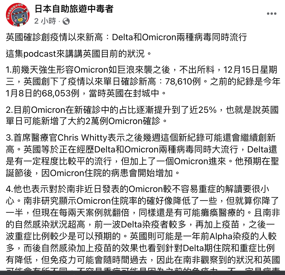 今前台大醫林氏璧指出,12月15日英國創下了疫情以來單日確診新高:78,610例,竟然比英國在封城中時的確診數字高。林氏璧引英國首席醫療官Chris Whitty的說法表示,目前英國Delta和Omicron兩種病毒同時大流行,並同表示對於南非近日發表的Omicron較不容易重症的解讀要很小心。因為雖然Omicron住院率的確降低了一些,但就算降一半但每兩天案例就翻倍,同樣還是有可能讓醫療系統癱瘓。