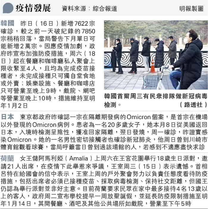 相關文章:【新冠變種】英國Omicron迅速蔓延 疫情警報升級 宣布18歲以上者距離第二針疫苗逾3個月可接種加強劑(更新12月14日)