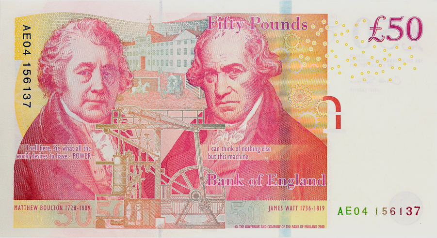 舊版50鎊鈔票是紅色的,背面是改良蒸汽機的博爾頓和瓦特。舊版20鎊鈔票是淡紫色的,背面的人物是著名經濟學家亞當·斯密。