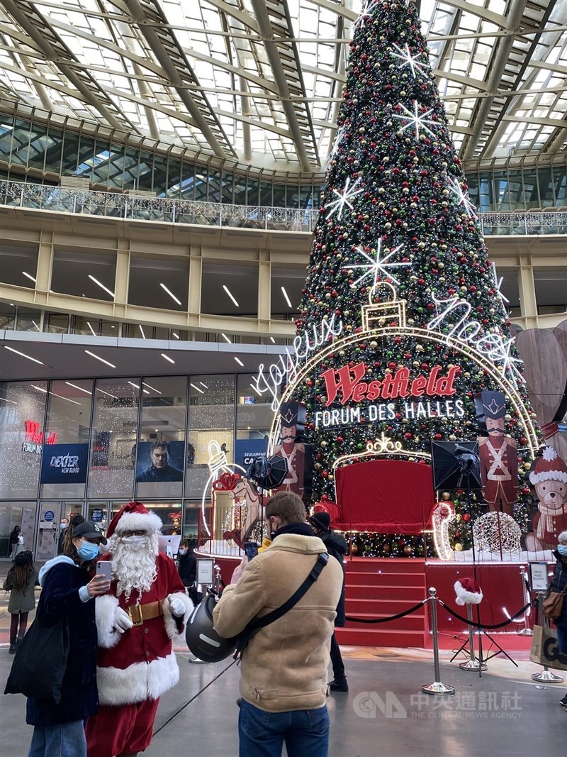 Omicron變異株擴散,英國、法國24日通報新增確診病例雙雙創新高。圖為巴黎民眾在平價購物商場「巴黎大堂」的耶誕樹前與耶誕老人合照。中央社記者曾婷瑄巴黎攝 110年12月24日