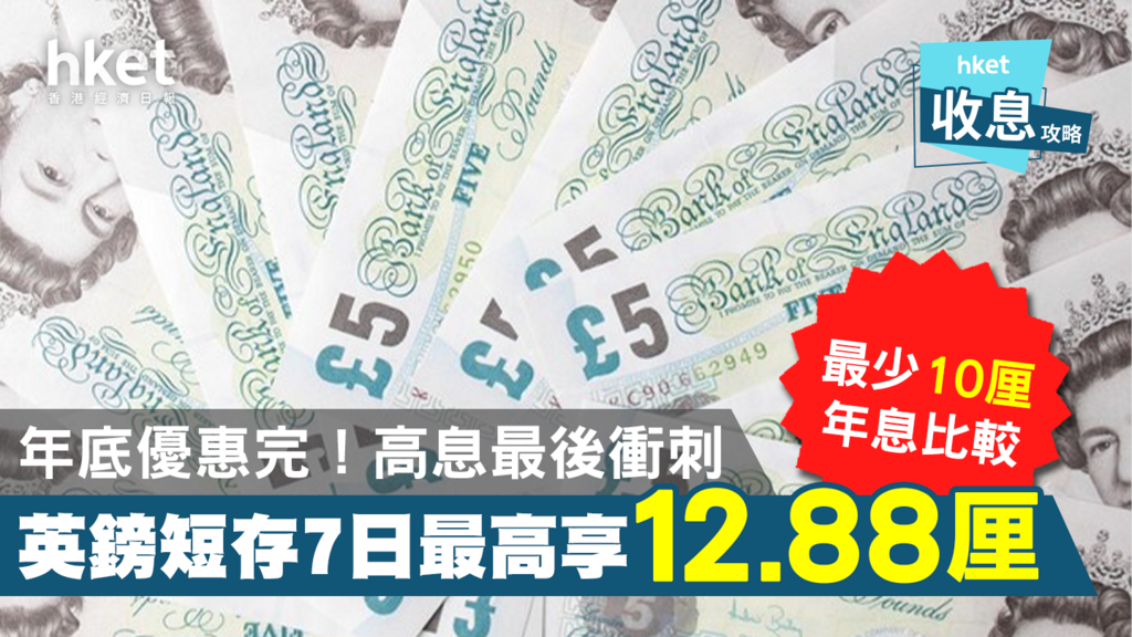 臨近年末,不少銀行定期存款優惠即將完結,如果想把握2021年最後數日,揀間高息定存有何選擇?本網搜羅了7日英鎊定存,年息最高可達12.88厘,有興趣就要快手啲啦!