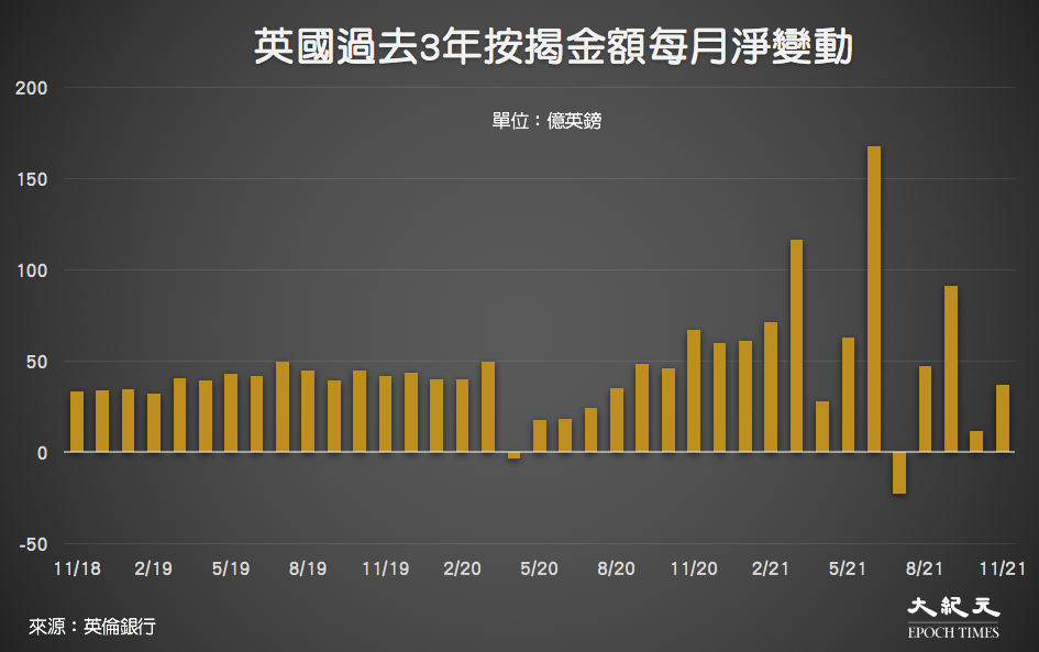 截至2021年11月,英國過去3年按揭金額每月淨變動。(來源:英倫銀行/大紀元製圖)