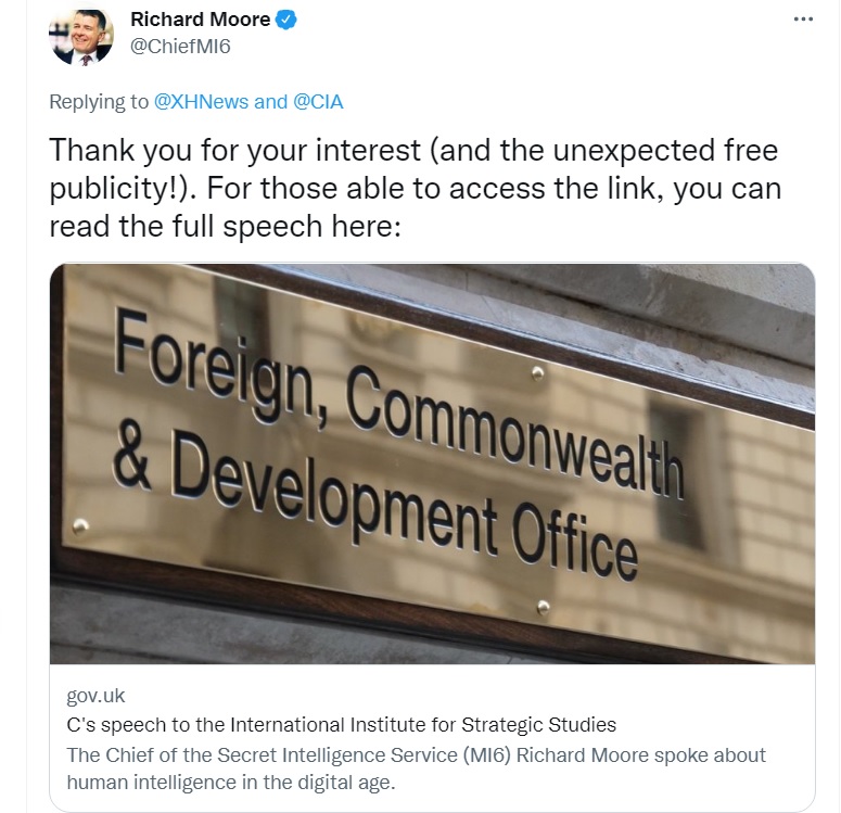 一向保守的英國這回出奇地迅速反應,而且是英國軍情六處主任摩爾親自出面,他在推特上直接點名新華社、美國中央情報局「Replying to @XHNews and @CIA」回應,表示感謝新華社的關注,以及意想不到的免費宣傳!摩爾還意有所指的表示,對於那些能夠訪問影片鏈接的人,不妨看一下摩爾之前在國際戰略研究所(IISS)的完整演講。