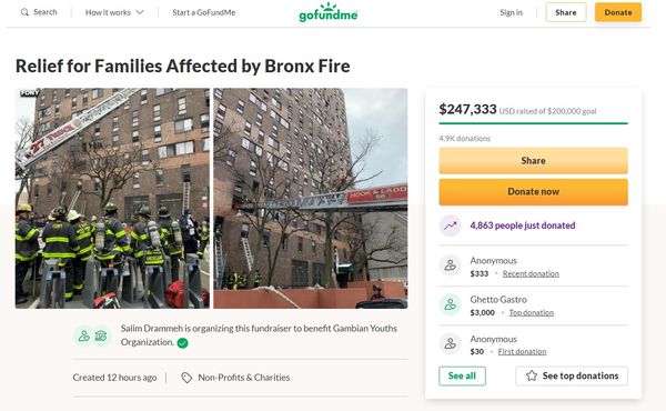 據《紐約郵報》報導,這起眾籌活動是甘比亞青年組織(GYO)所發起的。負責人德拉梅(Salim Drammeh)寫道,這場5級大火燒毀了布朗克斯區(Bronx)19樓高的建築,造成19人死亡、數十人傷重命危,也讓建築內的120戶人家一夕間失去家園,「我們懇求大家慷慨解囊,幫助這些受災戶」。