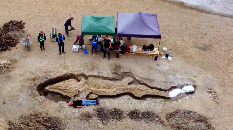 英國英格蘭拉特蘭湖(Rutland Water)水庫近日完成挖掘被暱稱為「海龍」的10公尺長史前魚龍(ichthyosaur)化石,距今有1.8億年歷史,被專家喻為英國考古史上最偉大的收穫。(圖擷取自水利公司Anglian Water官網)