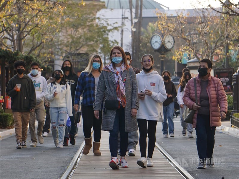 科學家看到COVID-19變異株Omicron疫情在英國已達高峰的訊號,並推測英美兩國疫情或許會和南非類似,也就是在經過約1個月達到高峰後,開始顯著下滑。圖為美國洛杉磯民眾戴口罩出門。(中央社檔案照片)