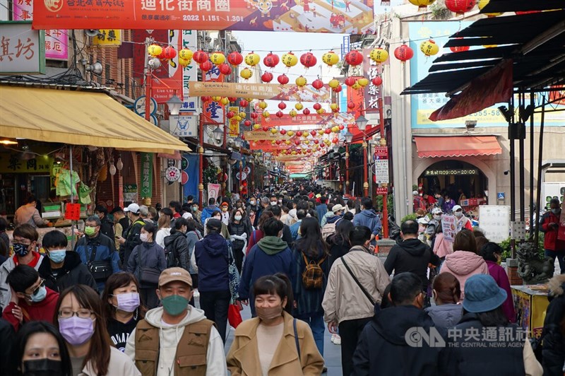 知名英國史學家佛格森在台北政經學院基金會首場講座中指出,COVID-19疫情經濟衝擊遠大於預測,台灣死亡數奇低,顯見防疫策略值得學習借鑑。圖為15日迪化商圈年貨大街。中央社記者劉建邦攝 111年1月15日