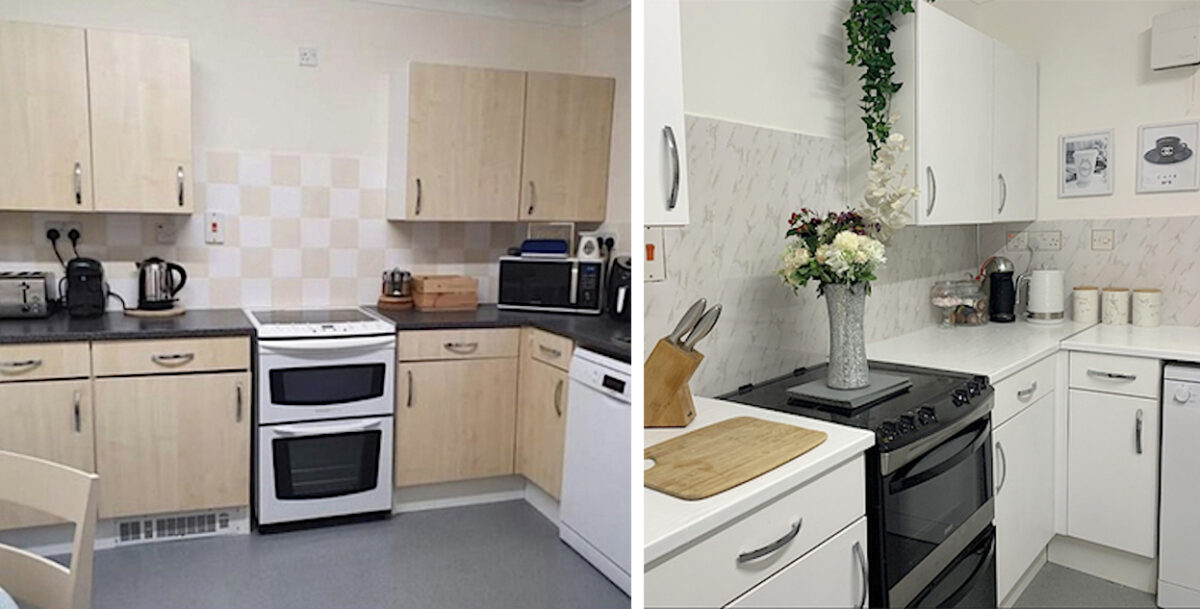 首先解決的是廚房。瓊斯使用PVC牆板材料製作出具有大理石效果的防濺牆,每塊牆板的成本僅為5英鎊(6.8美元)。然後她用粘性乙烯基將廚房的檯面包裹起來。
