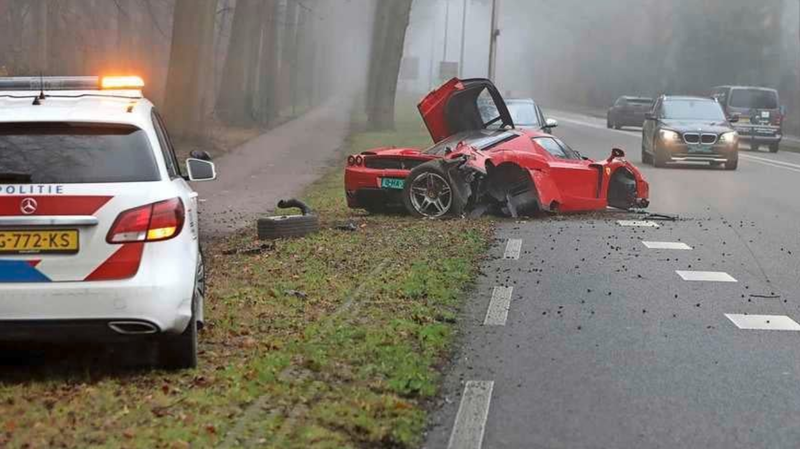 〔即時新聞/綜合報導〕荷蘭近日發生一起車禍,一名汽車經銷商技工,準備將現值約246萬英鎊(約新台幣9262萬元)的「法拉利Enzo」(Enzo Ferrari)跑車,開回銷售站時,不慎撞上樹樁,導致車體嚴重毀損,輪胎也硬生脫落,所幸技工送醫檢查後,並無大礙。