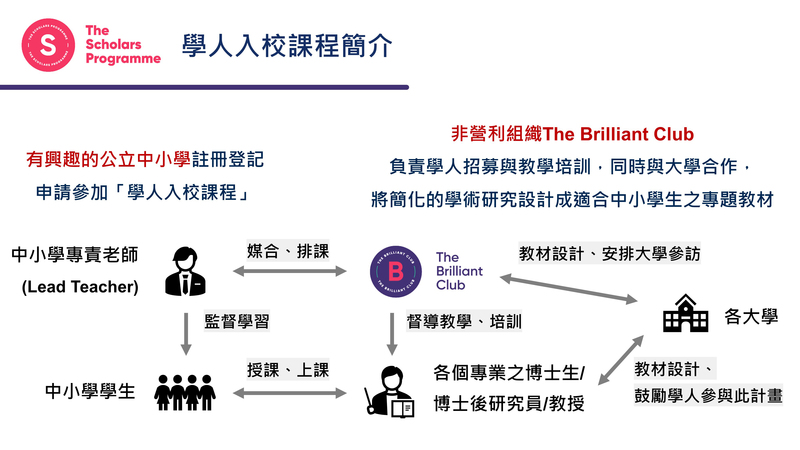 不僅提倡升學體制裡資源不平等的議題,The Brilliant Club更實際串聯了大專院校以及中小學,把平日在大學裡做研究的博士生、博士後研究員、以及教授,用兼職的方式媒合至中小學為弱勢孩子服務,讓這些學人(scholars)可以為教育不平等現況盡一點心力。這樣的計畫稱為「學人入校課程」(The Scholars Programme),The Brilliant Club會與各大學合作,邀請有意將自己的研究領域介紹給中小學生的學人,共同設計適合中小學生程度的專題教材。