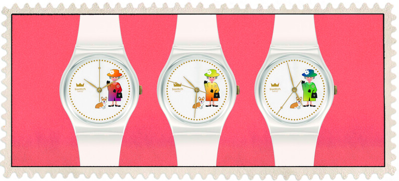 歡慶英國女王登基滿70週年,Swatch特別設計女王駕到紀念腕錶,隨著日期變換,女王的時髦穿搭也會跟著改變。