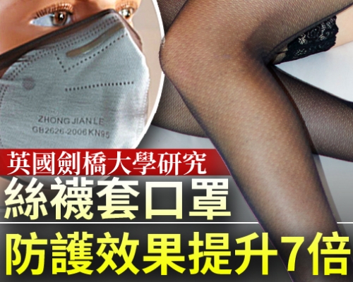 絲襪套頭會令人聯想到電影裏賊仔打劫的情景,又或是綜藝節目的搞笑橋段,但原來絲襪套頭可以成為減低染疫的好工具。英國劍橋大學一項研究顯示,將絲襪套在口罩外,可大幅增加口罩的密合度,有效降低病毒透過口罩與臉部間空隙入侵的機會,降低新冠病毒吸入量,防疫效果增七倍之多,至於絲襪顏色並無顯著影響。該論文發表在學術專業期刊《PLOS ONE》二月號。