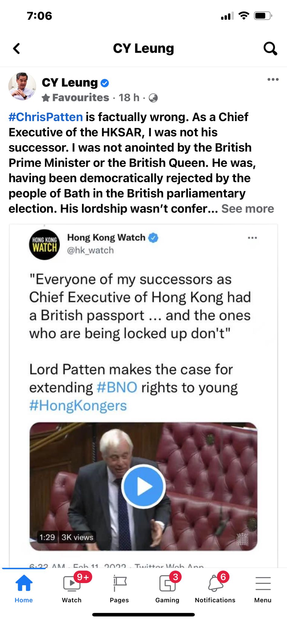 英國上議院於當地時間周四(10日),辯論放寬BNO簽證計劃,讓1997年後出生的港人單獨受惠。末代港督彭定康在會上稱歷屆香港特首是「叛徒」,又指這些「繼任者(successors)」不是自己擁有外國護照,就是家人擁有。他更反問稱,「為何他們擁有英國護照,而那些遭迫害或關押的人沒有?」