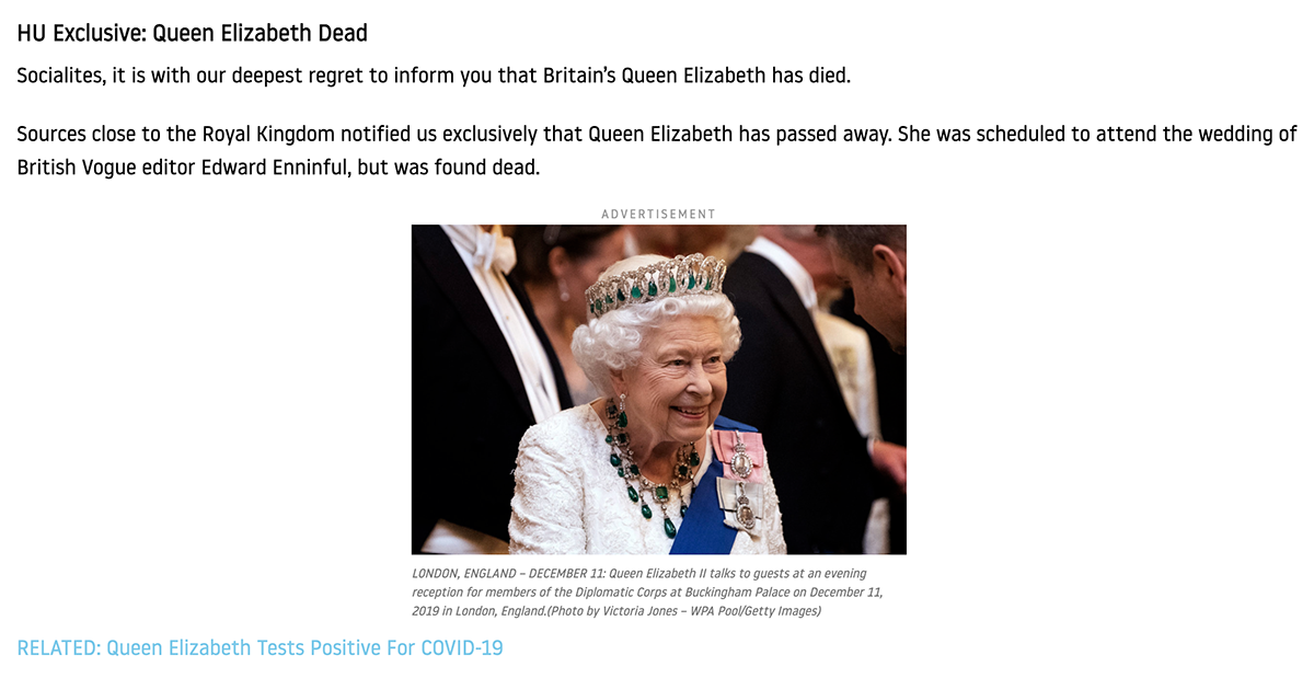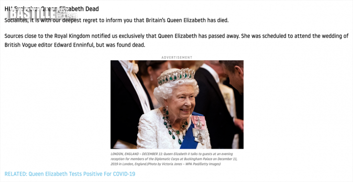 美國八卦網站《Hollywood Unlocked》獨家報道稱英國女皇伊麗莎白二世因新冠去世,引起社交媒體上一片嘩然。而就在幾天前,白金漢宮宣布英女皇確診身患新冠肺炎。雖然白金漢宮沒有立即對這個消息發表評論,但一名英國官員在Twitter上發文闢謠稱這是假新聞,其他外國媒體亦否認了此消息,荷蘭媒體《BNO NEWS》報道稱女皇依然健在。