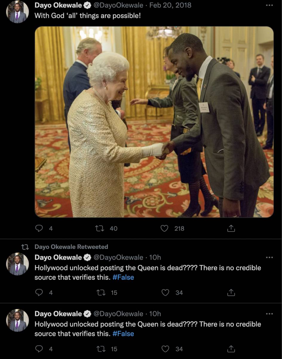 當有關英女皇去世的文章在網上瘋傳後,英國上議院幕僚長達奧克瓦勒(Dayo Okewale)在Twitter上發文稱,該說法是不屬實的:「《Hollywood Unlocked》發帖文稱女皇去世了????沒有可靠的消息來源證實這一點。」他還在相關推文上加上「虛假」的標籤。