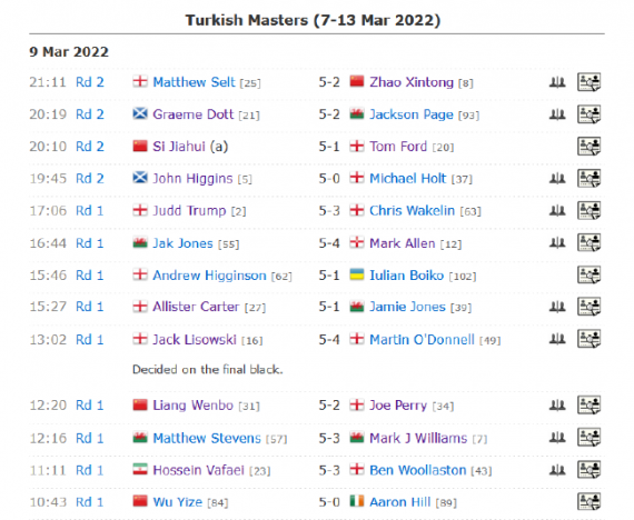除趙心童外,另外3位出場的TOP10種子中,2號種子賈德-卓林普和5號種子約翰-希堅斯雙雙獲勝,而7號種子馬克-威廉斯則止步正賽首輪。