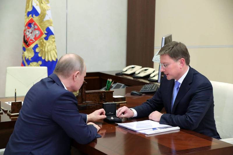 英國宣布最新一波制裁對象,包括全球最大鑽石生產商埃羅莎也被列入,圖為埃羅莎總裁伊萬諾夫(Sergei Ivanov,右)向普廷展示該公司的鑽石的資料畫面。(歐新社)