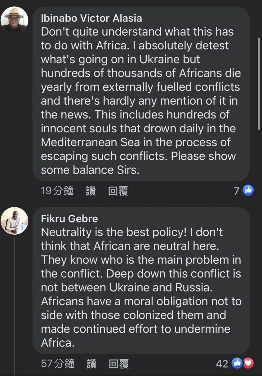 Babs Sillah則認為,這本質上是一場俄羅斯與美國之間的代理人戰爭,「別想唬弄非洲人一切只有俄羅斯的錯,西方國家也須負責,烏克蘭是唯一的輸家」。Charles Inwani表示:「我們剛從新冠肺炎疫情中恢復。非洲國家獲得多少疫苗?非洲只是被殖民、被殘忍對待,土地上的資源被他國收割。直到今日,非洲仍存在大量衝突。」