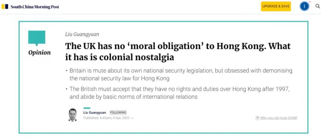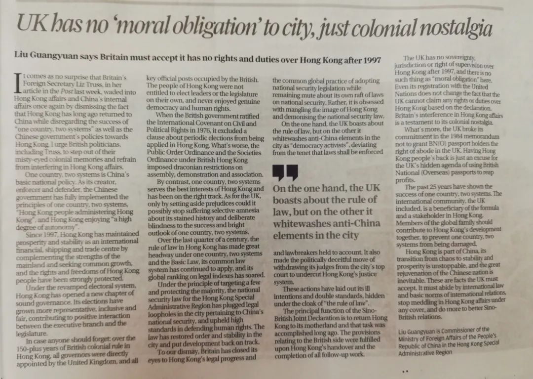 4月4日,外交部駐港公署劉光源特派員在《南華早報》發表題為《英國殖民舊夢可以休矣》的署名文章,嚴正駁斥英國外交發展大臣特拉斯日前在該報發表涉港錯誤言論,揭批英方罔顧事實,抱持雙重標準和殖民心態,強調香港回歸以來,「一國兩制」取得舉世公認的成功,敦促英方放棄殖民舊夢,停止以任何藉口干預香港事務。文章當日亦在該報網頁版刊登。全文如下: