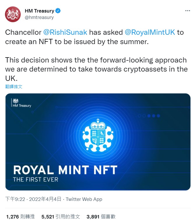 英國財政部前日在推特宣布,將在夏天之前發行官方NFT。   圖:翻攝自 HM Treasury Twitter