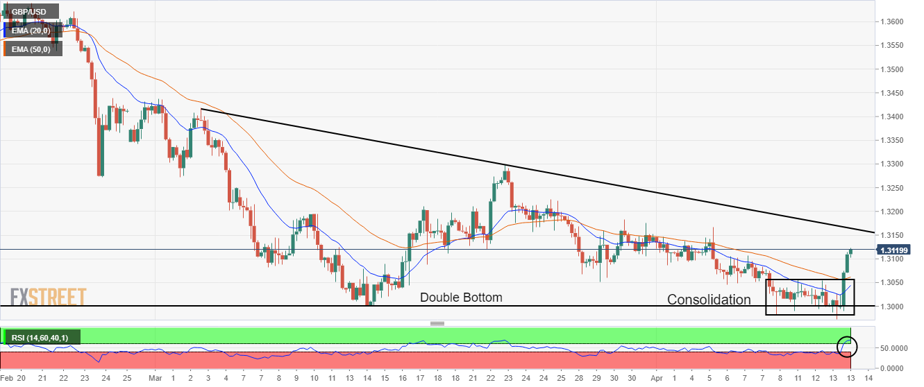 • 相對強弱指標(14)大幅朝北,表明英鎊/美元後市看漲。