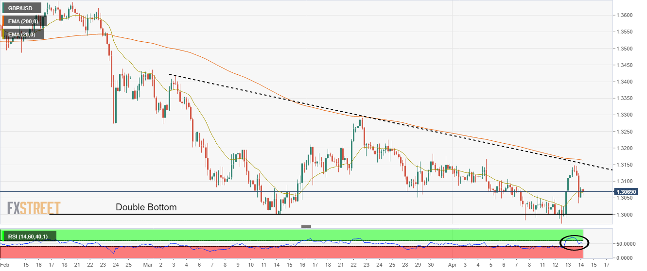 4 小時圖顯示匯價構築雙底,似乎有利於多頭。繼匯價重測 3 月低點 1.3000 附近的心理支撐位後,匯價出現巨大上行空間。匯價構築雙底表明在沒有大量空頭的情況下匯價出現看漲逆轉,同時測試關鍵底部。自 3 月 3 日高點 1.3418 以來連接 3 月 23 日高點 1.3299 的趨勢線繼續構成阻力。