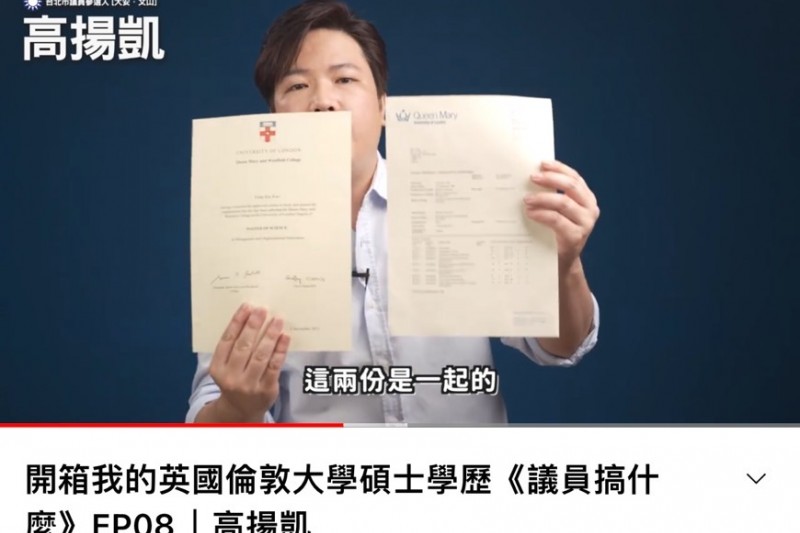 名嘴彭文正緊咬總統蔡英文偽造學歷,3年前向台北地院提起「確認蔡英文博士論文不存在」訴訟,但審理卻一波三折。總統論文學歷備受爭議,而就讀的英國倫敦大學也一戰成名,甚至遭質疑批評英國倫敦大學,是不是野雞學校,怎麼人人都宣稱自己是倫敦大學畢業的。台北市大安、文山市議員擬參選人高揚凱,表示自己就是英國倫敦大學畢業,為了消除各界聲音疑慮,開箱倫敦大學畢業證書,讓網友一探究竟。