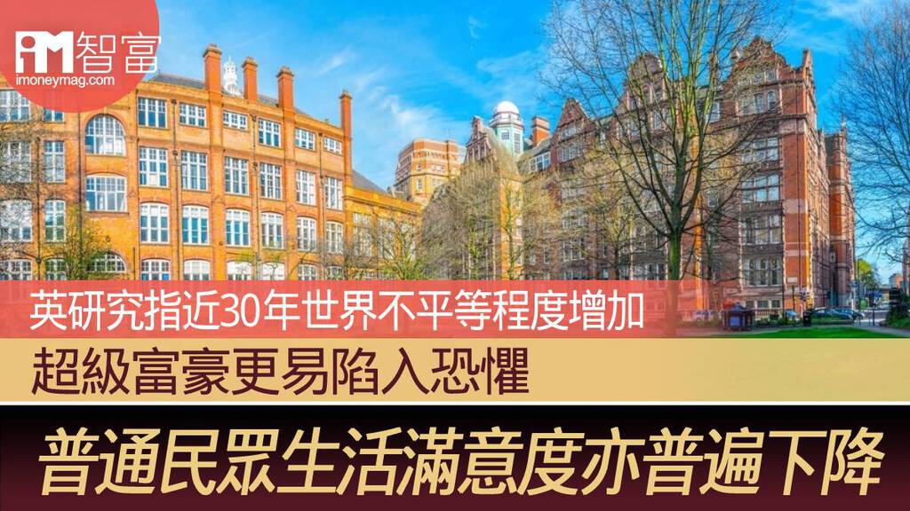 英國萊斯特大學 (University of Leicester) 近日發佈生活滿意度調查數據,以1到10評比生活滿意度。發現近幾十年來,大多數富裕國家不平等程度增加。研究發現,任何從不平等程度最低四分之一上升到最高四分之一的國家,生活滿意度都會下降約0.4分,富豪會產生信任危機,恐懼等心理問題、普通人亦會感覺被社會排斥。