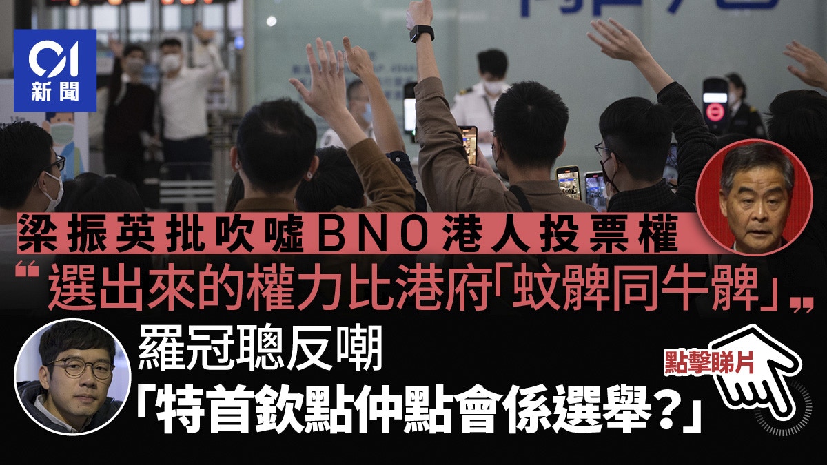 全國政協副主席、前特首梁振英日前接受電台訪問,指持英國國民(海外)護照(BNO)赴英居住的人並非移民、只是「移居」,這些人不願交還特區護照或身份證,是要留有「回流」後路;又點名「流亡」英國的前香港眾志主席羅冠聰,批評他吹噓BNO簽證港人在英國有投票權,但「選出來的市議會權力,比起香港特區政府是『蚊髀同牛髀』。」