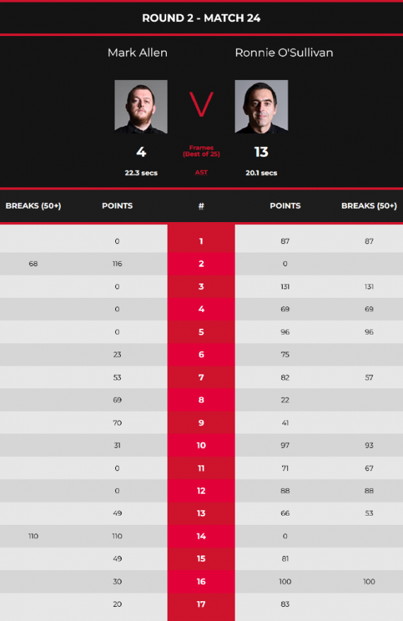 但本場比賽,從始至終整體呈現一邊倒的情況。在第一階段中,羅尼-奧蘇利雲就憑藉1杆破百和4杆50+,打出一波5連鞭,大比分6-2領先結束了第一階段。第二階段中,他再接再厲,又打出1杆破百和4杆50+,以大比分12-4領先結束第二階段,並拿到賽點。