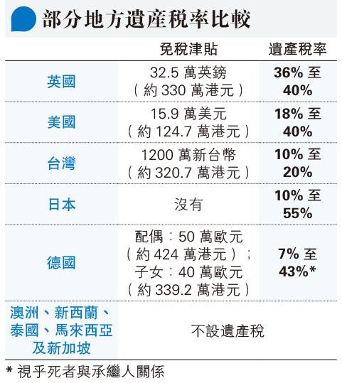 其他海外國家的遺產稅亦不少,例如美國遺產稅由18%至40%不等,視乎資產多少,每一年的免稅津貼不同,2021年為15.9萬美元(約124.7萬港元),外國人均可擁有1.5萬美元稅收抵免。再以近年港人熱愛移居的英國為例,遺產稅(IHT)高達40%,不過每名人士都可以享有32.5萬英鎊的免稅遺產稅津貼,免稅津貼亦可轉贈給配偶。倘若相親離世,子女可享有65萬英鎊的免稅津貼。