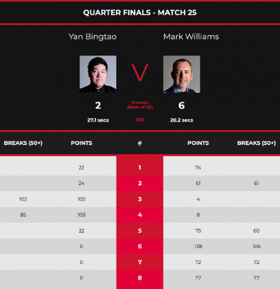 本場比賽,又是馬克-威廉斯率先發動,憑藉1杆60+,他以74-22和61(61)-24連勝2局,大比分2-0領先。不過隨後,顏丙濤打出1杆破百和1杆80+,以102(102)-4和103(85)-8連扳2局,將大比分扳為2-2平進入中場休息。