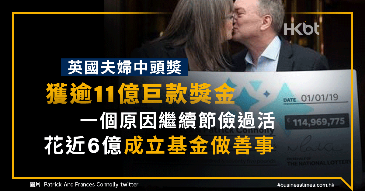 綜合外國傳媒報道,一對逾50歲英國北愛爾蘭夫婦Patrick Connolly與Frances Connolly,於2019年元旦買彩票中頭獎,獲得高達1.15億英鎊(約11.2億港元)獎金。
