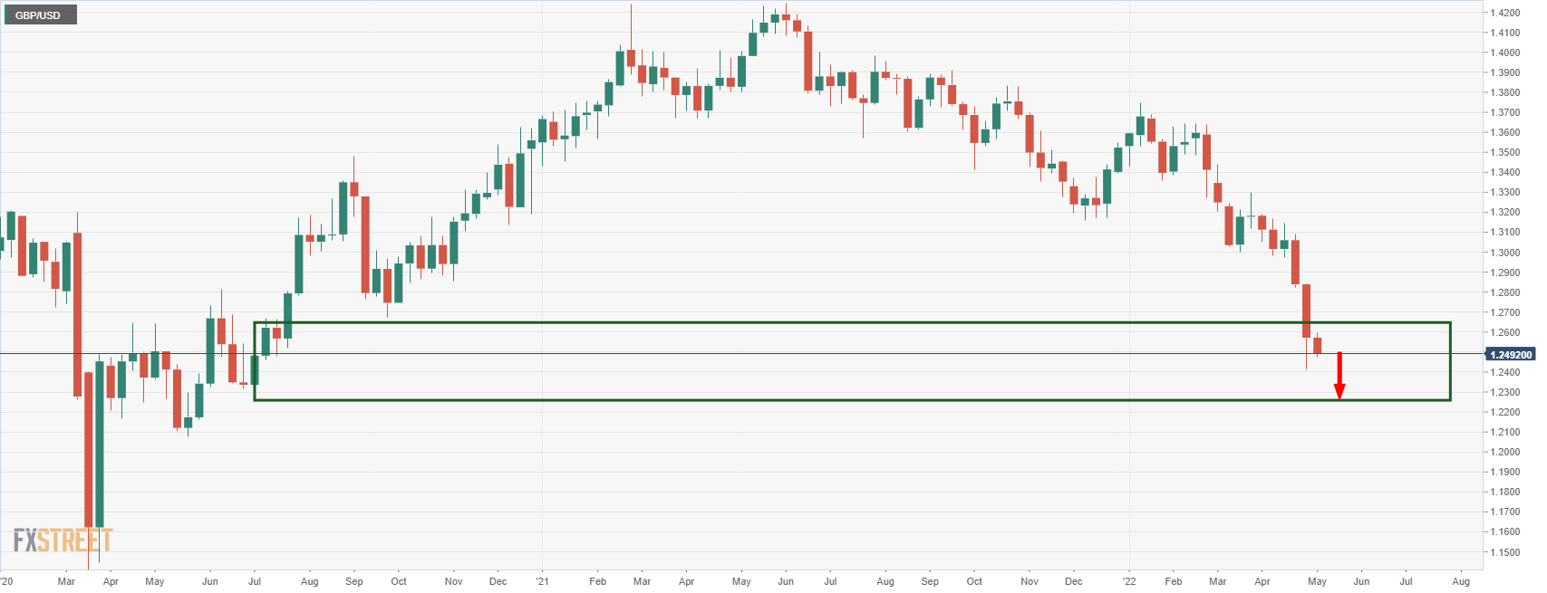 英鎊/美元正接近週線需求區域,在觸及 2020 年 7 月低點 1.2250 附近之前還存在更多下行空間。