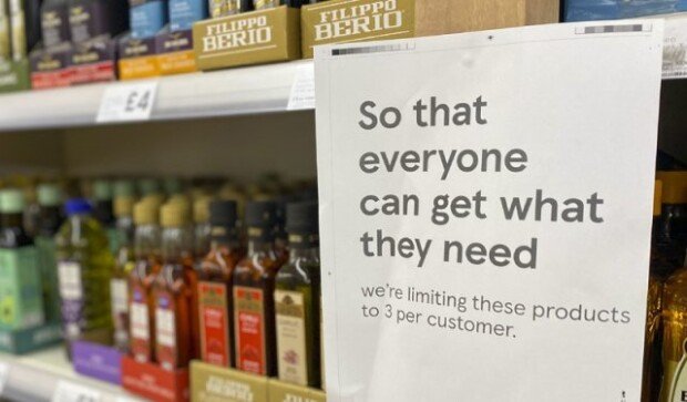 在食用油進口量的83%依賴烏克蘭的英國,出現了缺貨現象。英國代表性連鎖超市特易購的食用油陳列臺上貼出了“食用油每人限購3瓶”的告示。英國其他連鎖超市Witrose、Morrisons限制最多購買2瓶。