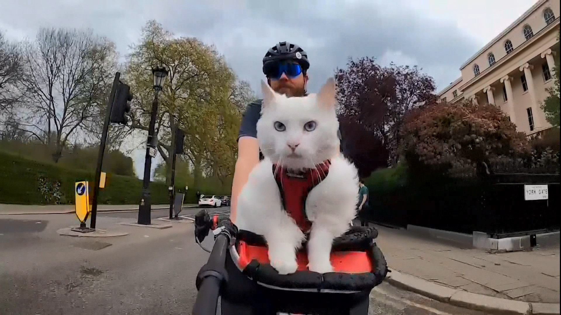 主人騎著單車漫遊在倫敦的大街小巷,這隻暱稱席姬的貓咪,則坐在車頭前看盡倫敦的春色風光,主人還一邊利用運動攝影機,拍下牠威風凜凜的萌樣。