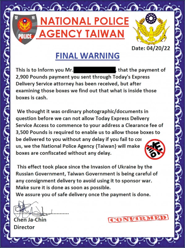 刑事局國際科表示,歹徒鎖定有寄送國際包裹的民眾,假冒國外快遞公司寄送電子郵件,郵件中夾帶全英文的假公文,並偽造警政署署長署名,宣稱因政府要避免民眾資助烏、俄戰事,因此查獲其夾帶現金後,必須支付英鎊三千五百元,否則要沒收貨物,誘使民眾匯錢。