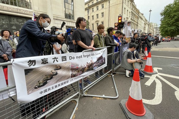 而倫敦市中心下午亦有另外兩場悼念六四的集會,其中一場由7個在英港人組織聯同在英烏克蘭人舉辦,在唐寧街首相府外齊聲向俄羅斯和中共極權說不。
