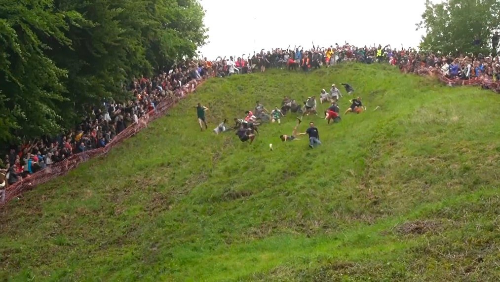 在顛簸的斜坡高速向下衝,很難有人全身而退,為了追逐一顆重達3.6公斤起司,參賽者幾乎都是用滾的下山。重力加速度實在太危險,山腳下已經有志工等著,當參賽者的緩衝。